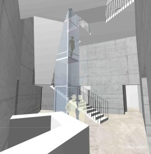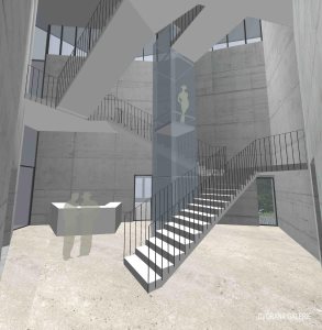 I'm going through it, exploring it, we're at the beginning of the work. Soon, the feeling that it is a rare space that raises its head, that makes you raise your head, begins to prevail in me. I obey and raise it. It occurs to me that I need to understand its cross-section - the cross-section. I study the section and perceive that the space is composed of heavy architectural elements - authentic old fragments and recently added new elements. But what connects them, what is their bond? I sense the pulsating space like a breath when reading a well-structured text. Heavy passages are difficult to read with long concentrated breaths. Gradually, though, the possibility of a light, relieved exhale comes. During this, stars of hope pop up before the eyes and bubbles of oxygen refresh the brain.